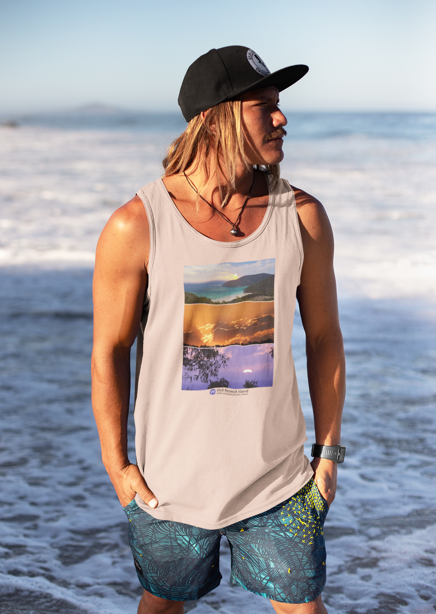 ASColour unisex lightweight Barnard tank with 3 Keswick Island sunset images & the Visit Keswick Island logo in black text. Available in white, white marle, pistachio & pale pink in sizes XS-2XL.