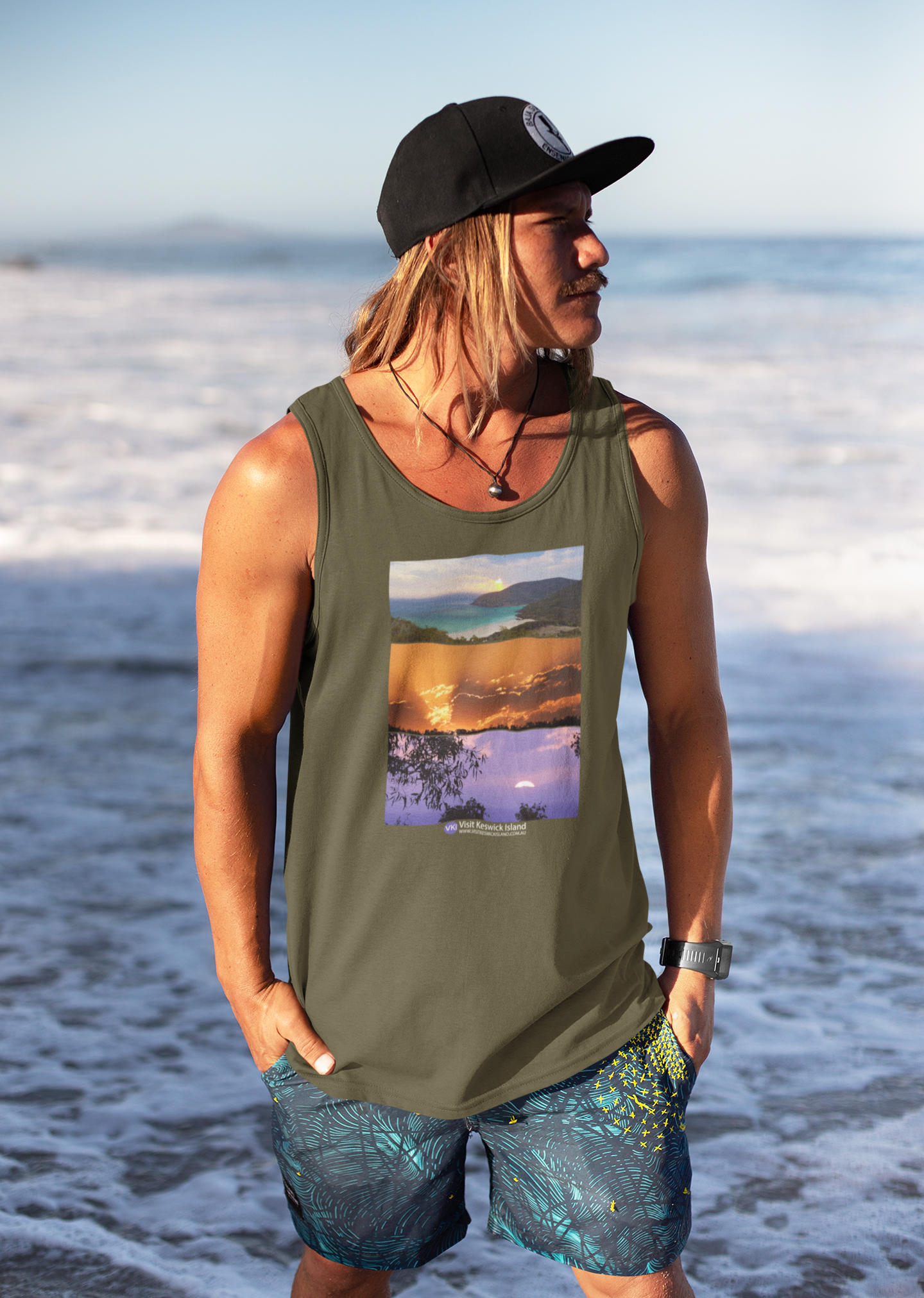 ASColour unisex lightweight Barnard tank with 3 Keswick Island sunset images & the Visit Keswick Island logo in white text. Available in black, coal, petrol blue & army in sizes XS-2XL.