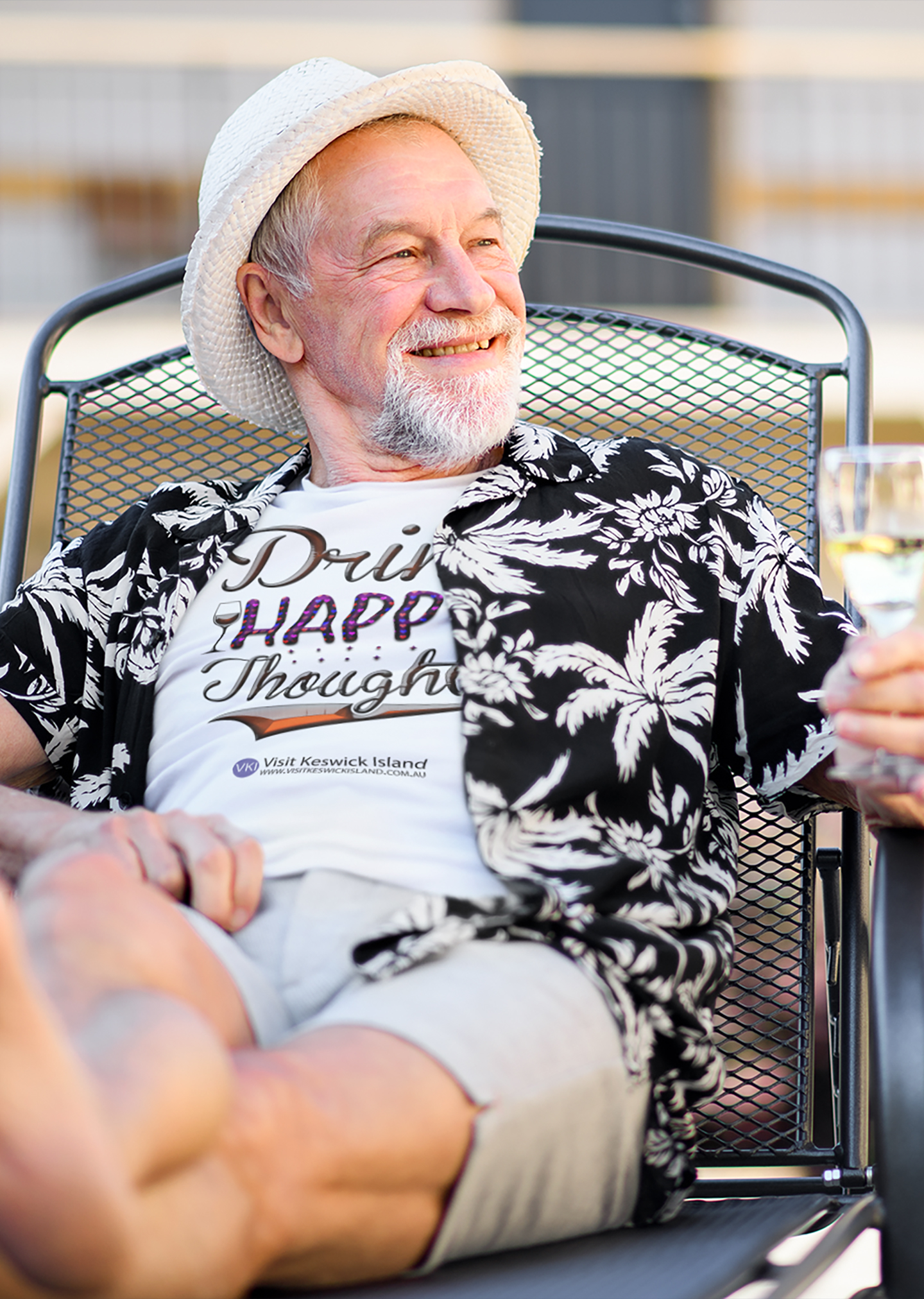 CB Clothing Men's mid-weight crew neck short sleeve t-shirt with Drink Happy Thoughts design & Visit Keswick Island logo in black. Available in white in sizes XS-3XL: