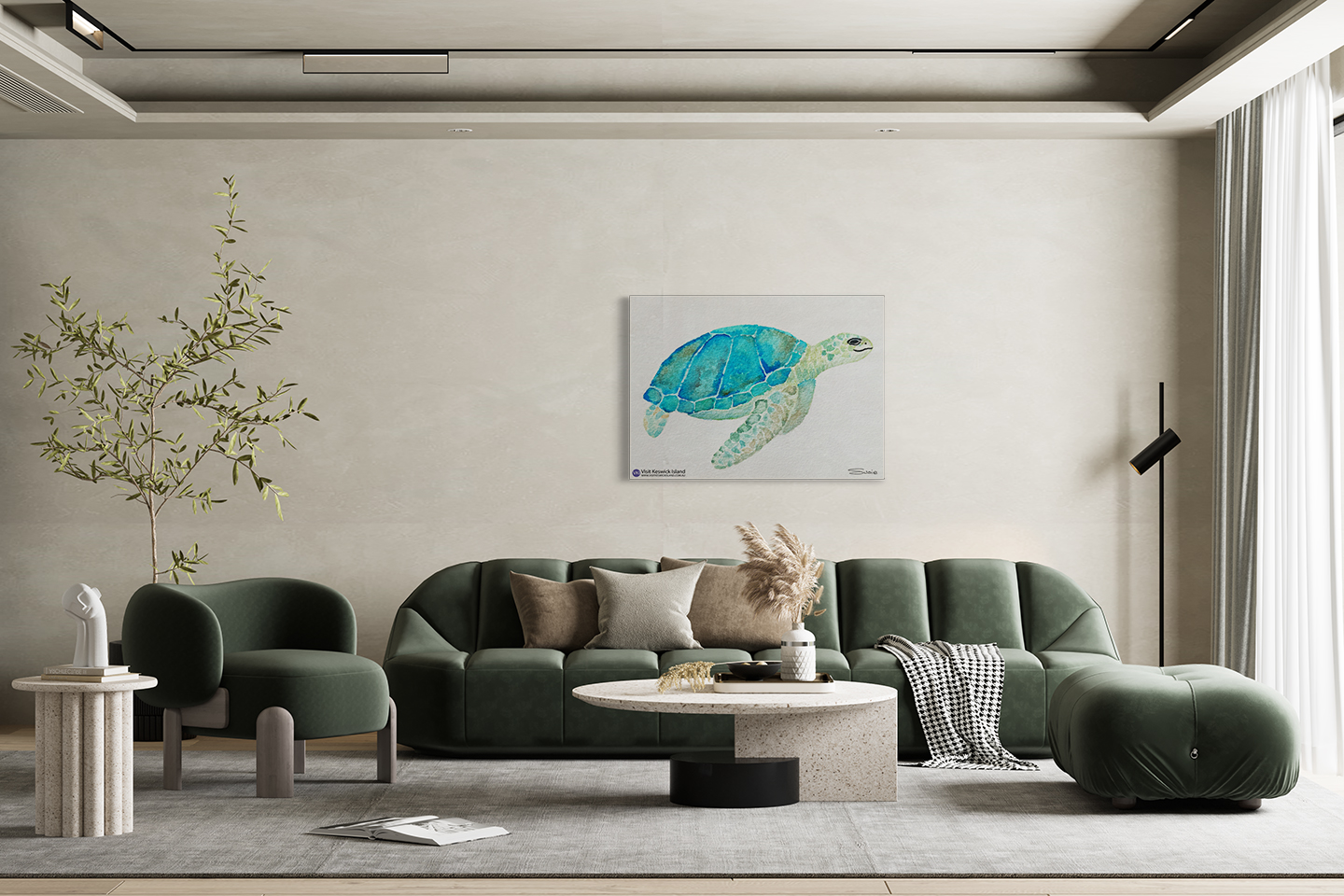 Happy Turtle watercolour print on canvas with a white outer border and hanger set included. Available in sizes 40x30cm and 80x60cm.