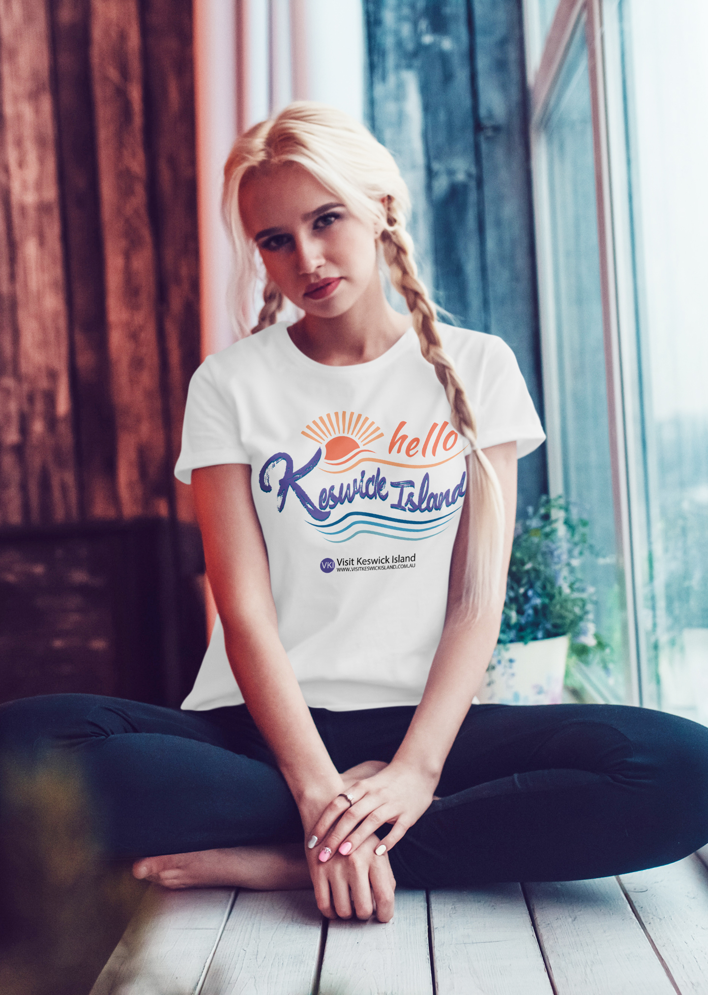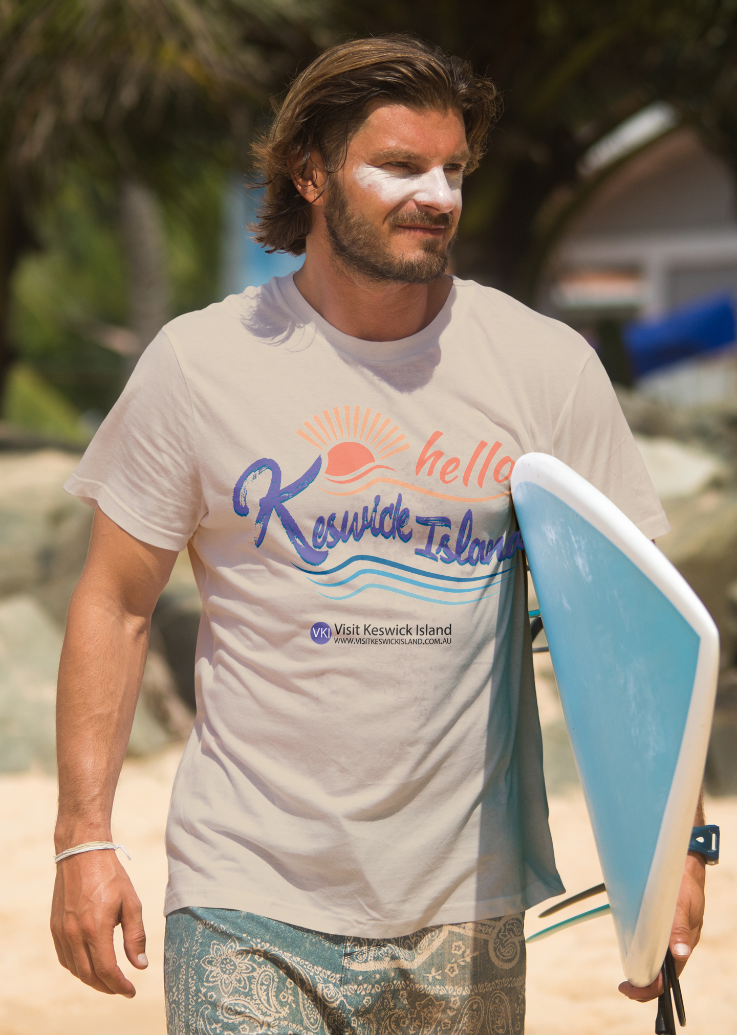 Gildan unisex lightweight soft tee with Hello Keswick Island across the chest in purple text. Available in white & sand in sizes XS-3XL: