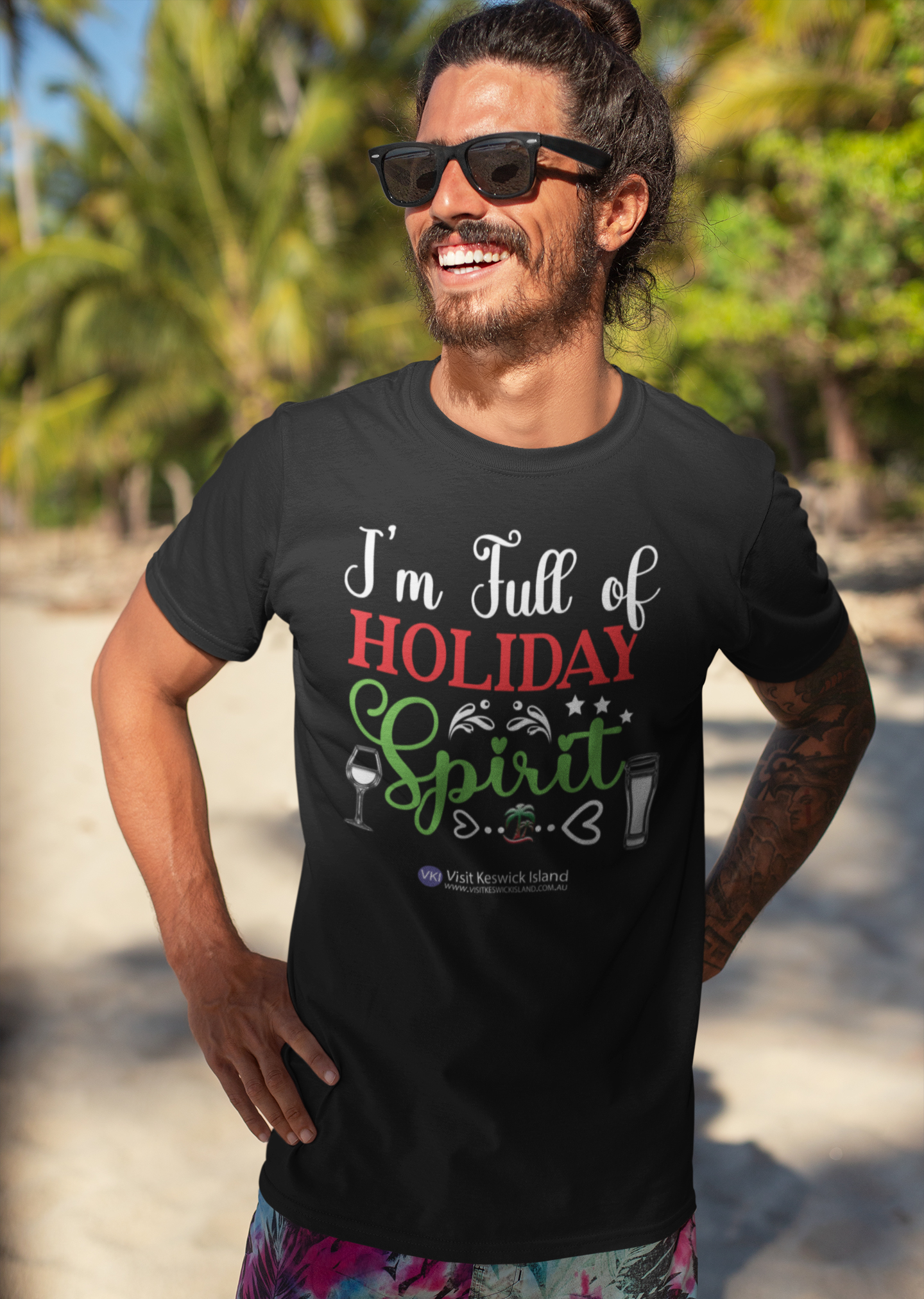 ASColour men’s light weight Paper crew neck t-shirt with I’m Full of Holiday Spirit design & Visit Keswick Island logo underneath in white text. Available in black & grey marle in sizes S-2XL.