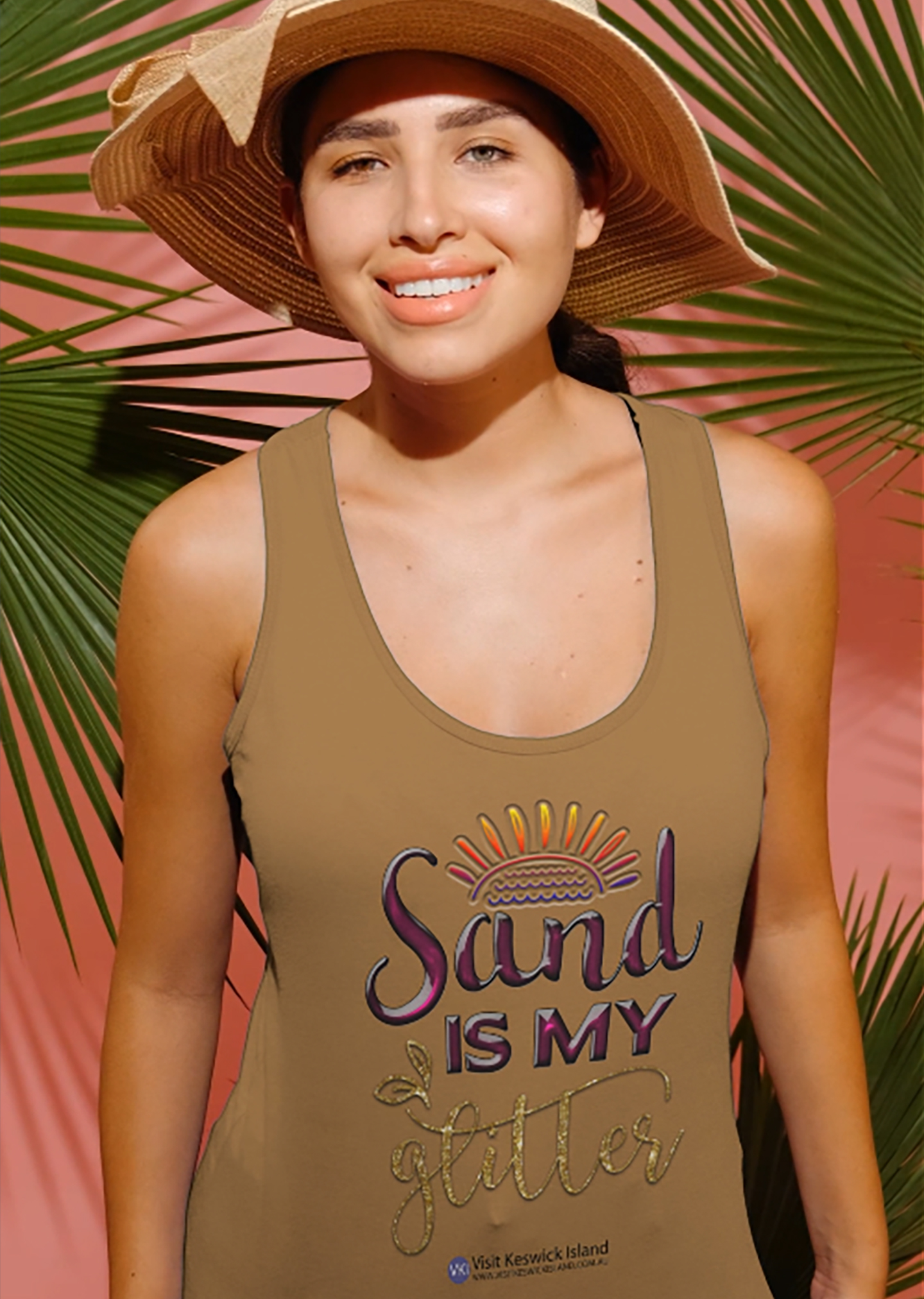 ASColour Ladie's Sunday singlet with Sand Is My Glitter design & Visit Keswick Island logo underneath in black text. Available in white & camel in sizes XS-XL: