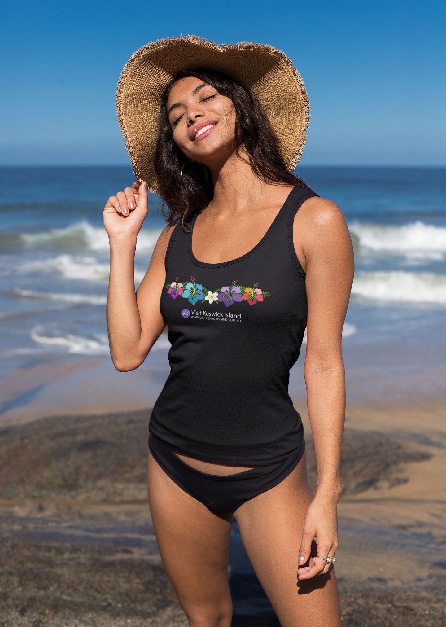 ASColour Ladie's lightweight Tulip singlet with tropical flowers design & Visit Keswick Island logo underneath in white text. Available in black in sizes XS-XL: