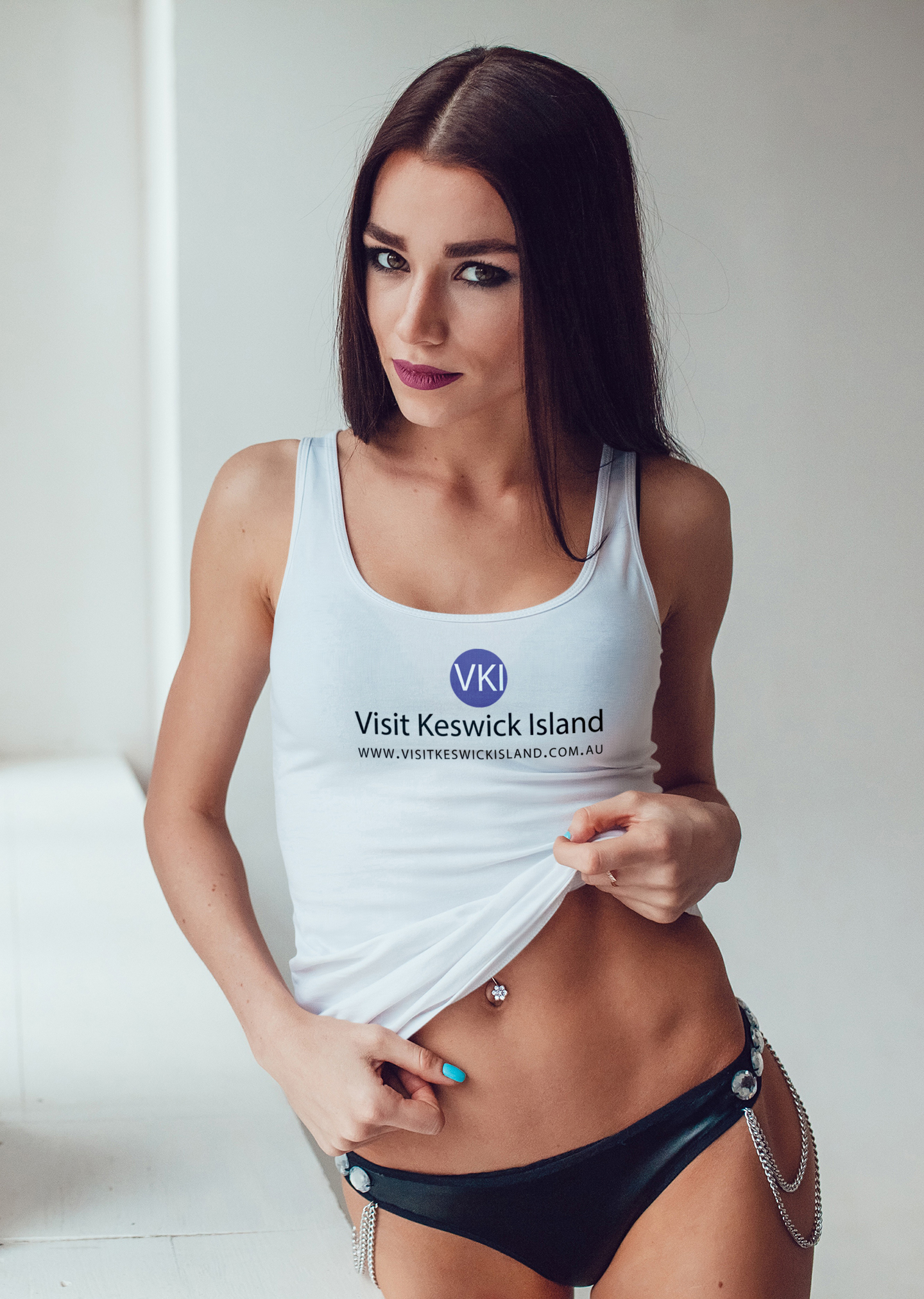 ASColour Ladie's lightweight Tulip singlet with a large pocket-style Visit Keswick Island logo across the chest in black text. Available in white in sizes XS-XL: