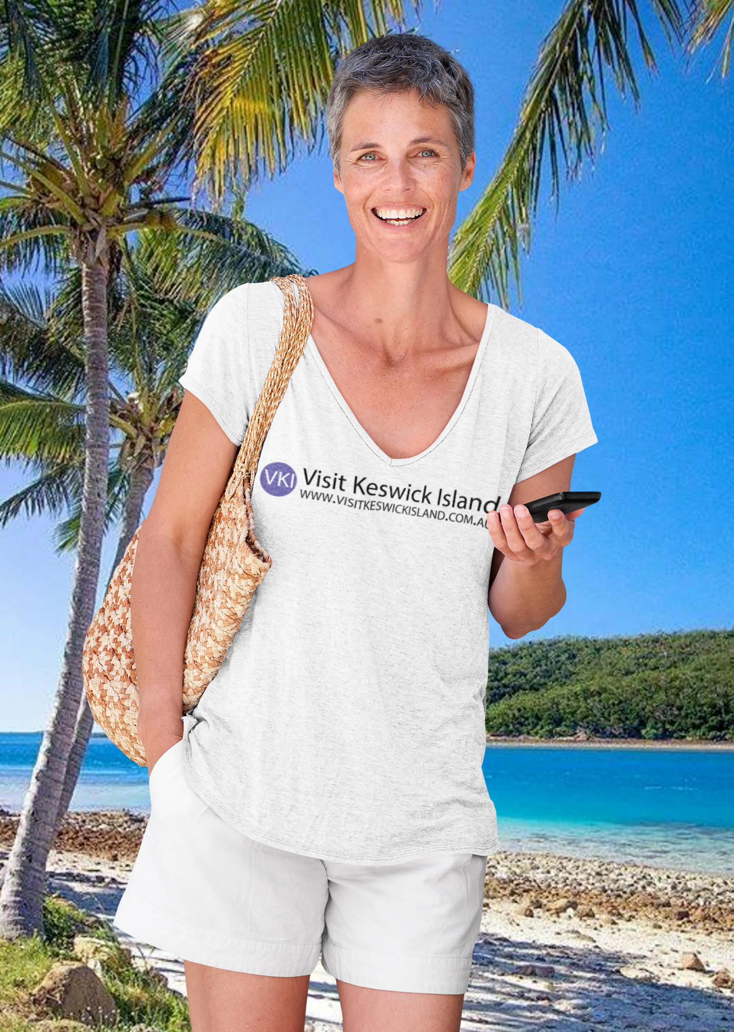 ASColour Ladie’s lightweight Bevel v-neck tee with a Visit Keswick Island logo across the chest in black text. Available in white in sizes XS-XL.