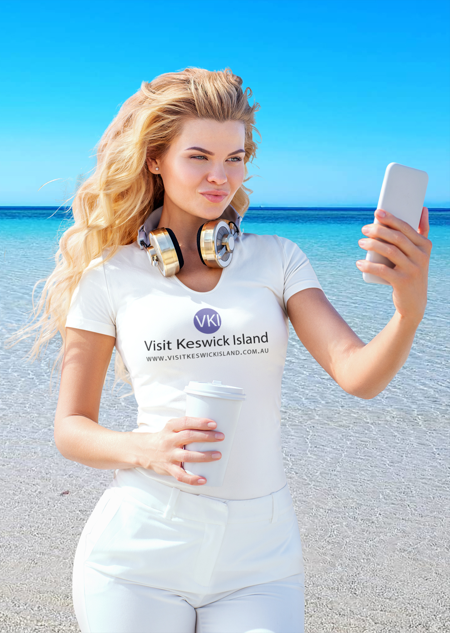 ASColour Ladie's lightweight Bevel v-neck tee with a large Visit Keswick Island logo across the front in black text. Available in white in sizes XS-XL: