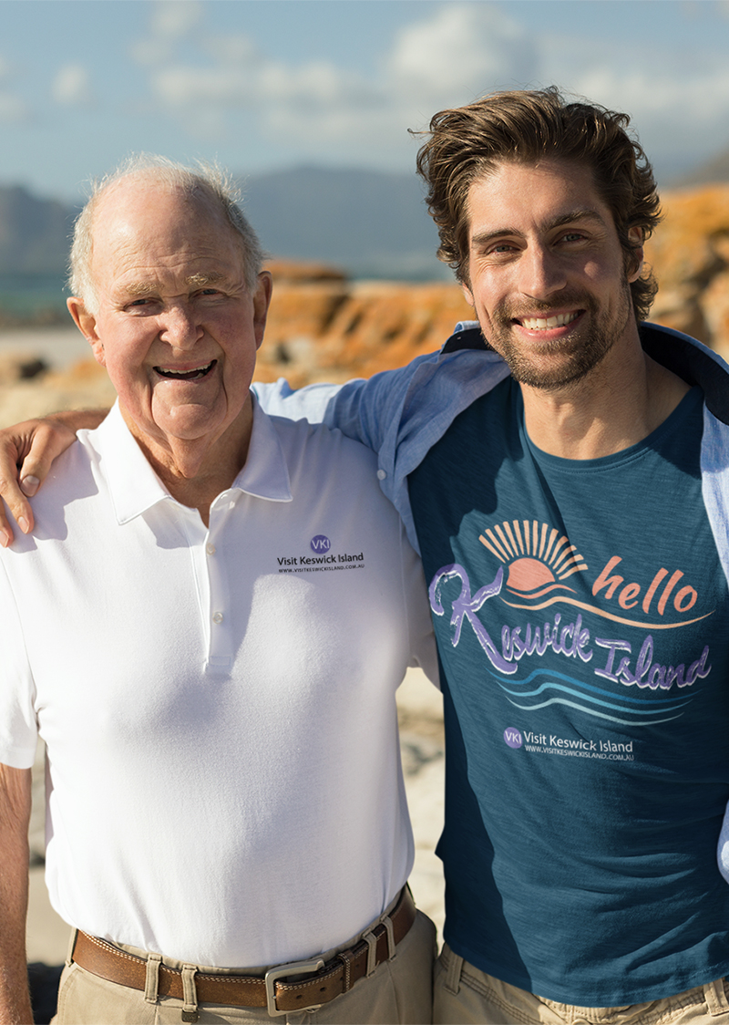ASColour Men’s heavyweight Chad polo with a small Visit Keswick Island logo across the chest in black text. Available in white in sizes S-3XL.