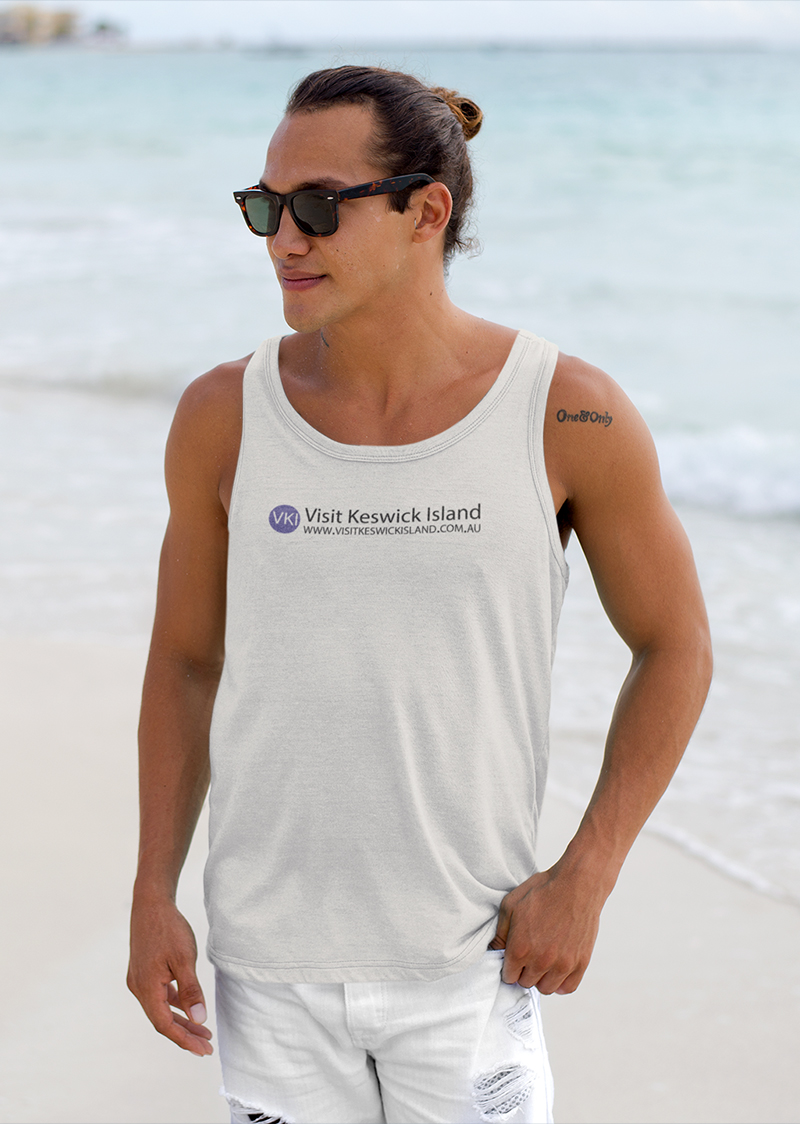 ASColour Men's lightweight Lowdown tank with a large Visit Keswick Island logo across the chest in black text. Available in white in sizes S-2XL:
