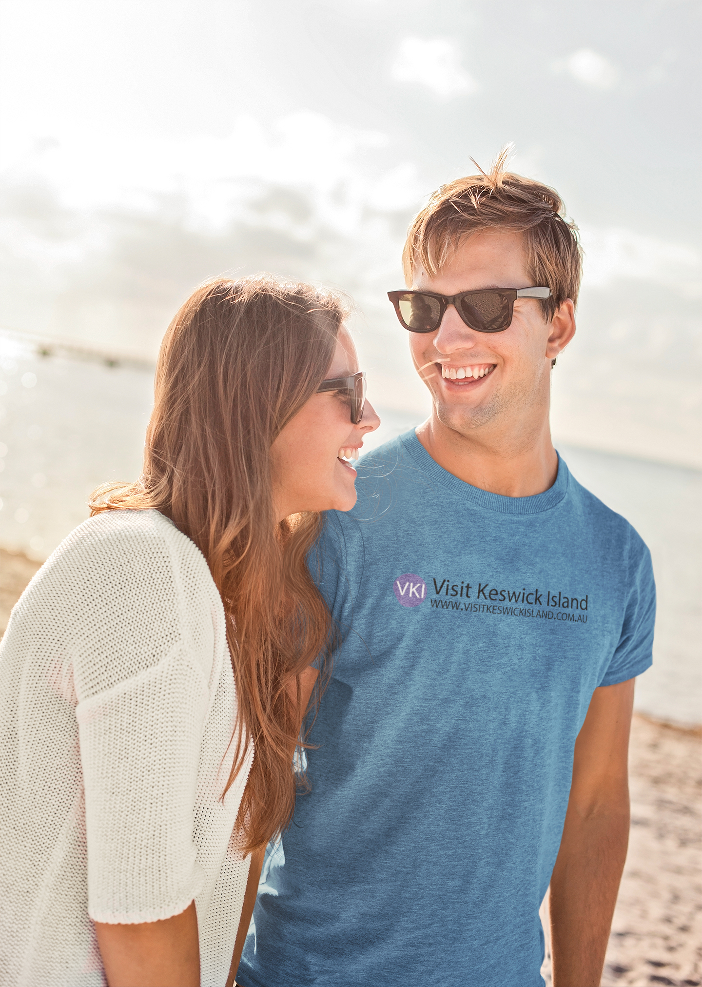 ASColour Men's Staple crew neck t-shirt with large Visit Keswick Island logo across the front in black text. Available in white, Carolina blue, artic blue, orange & light grey in sizes 4-5XL: