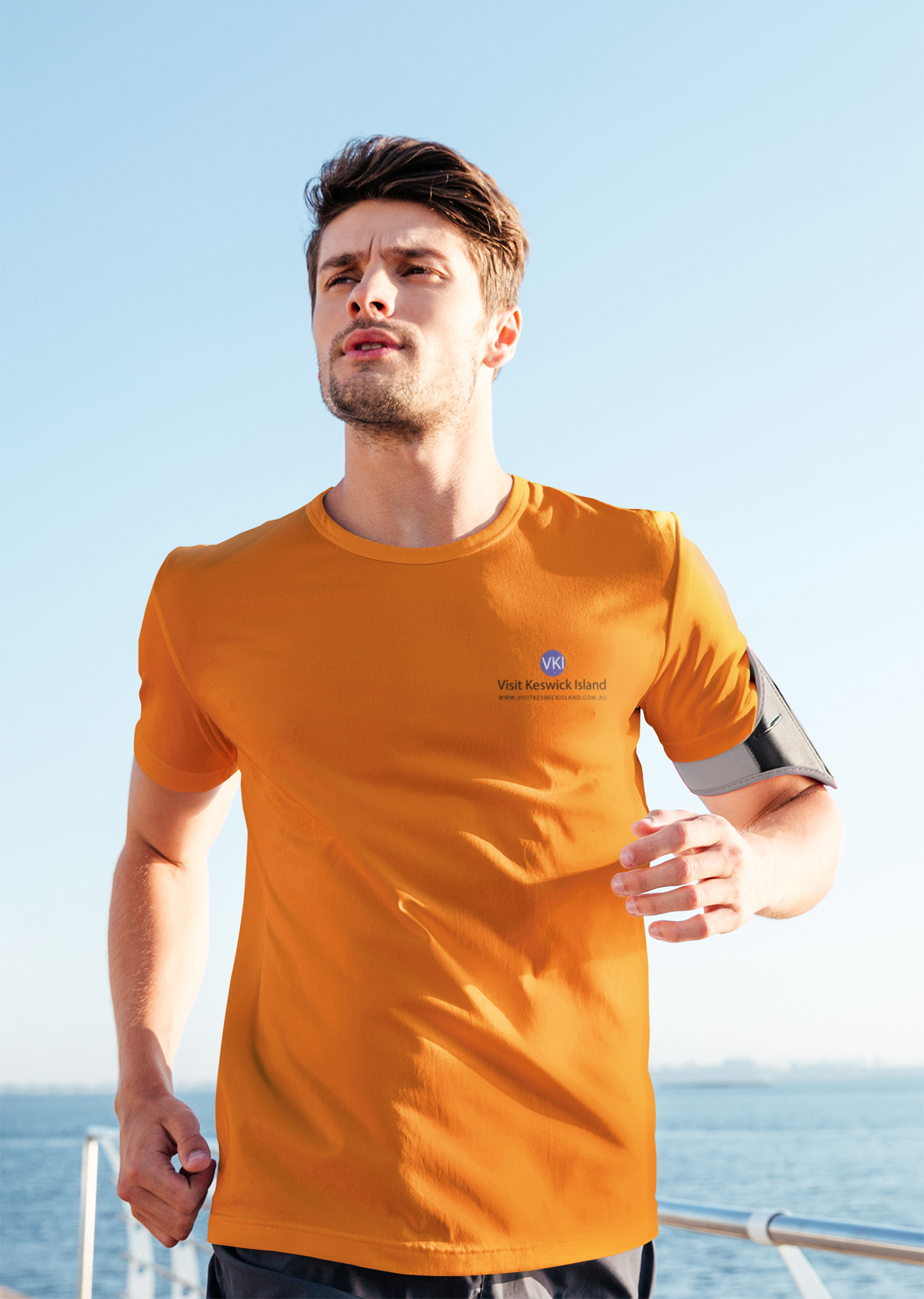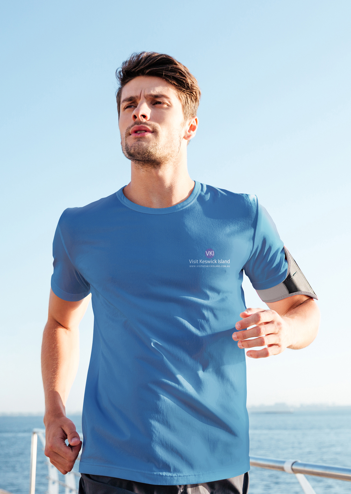 ASColour men's mid-weight Staple crew neck t-shirt with a small Visit Keswick Island logo on the left-hand side of the chest in black text. Available in white, Carolina blue, artic blue, orange & light grey in sizes S-3XL: