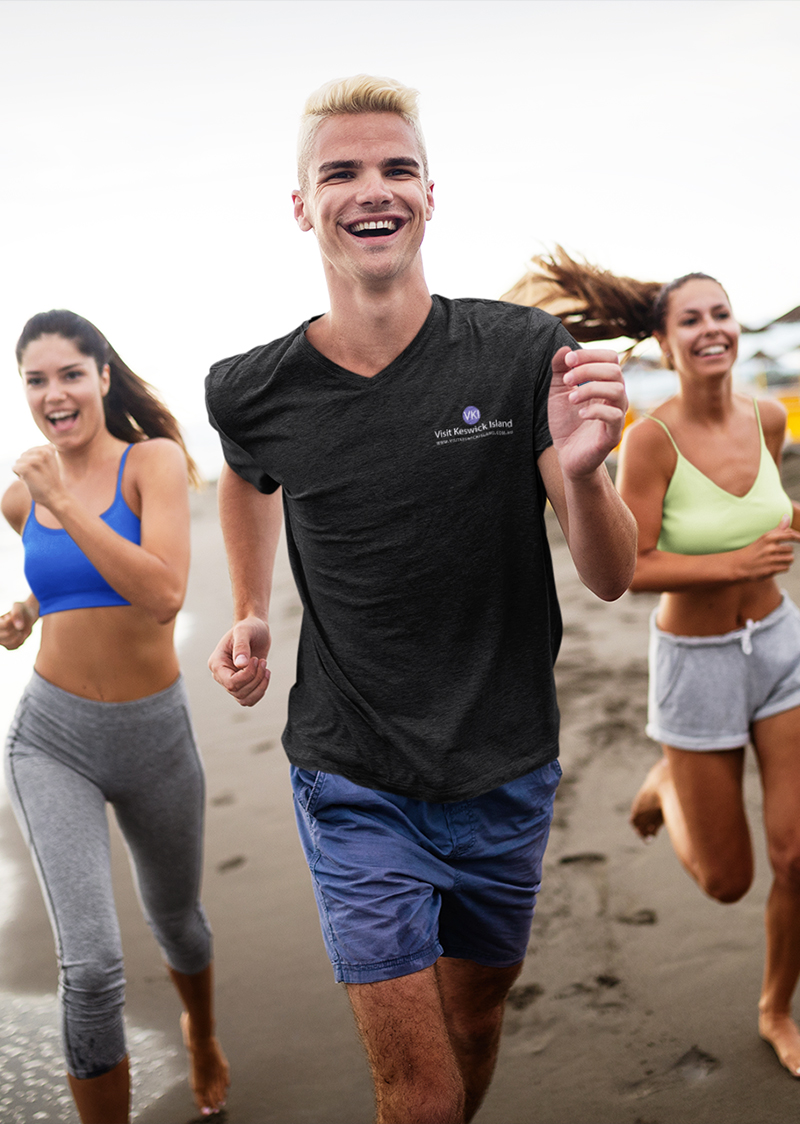 Visit Keswick Island V-Neck T-Shirt – White Text on LHS Chest